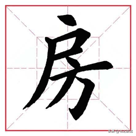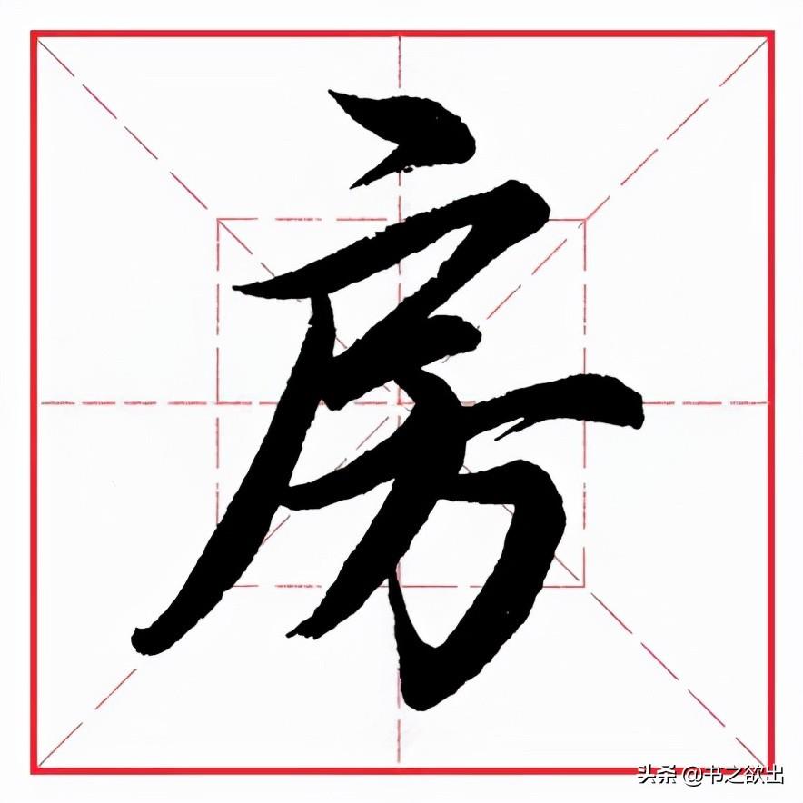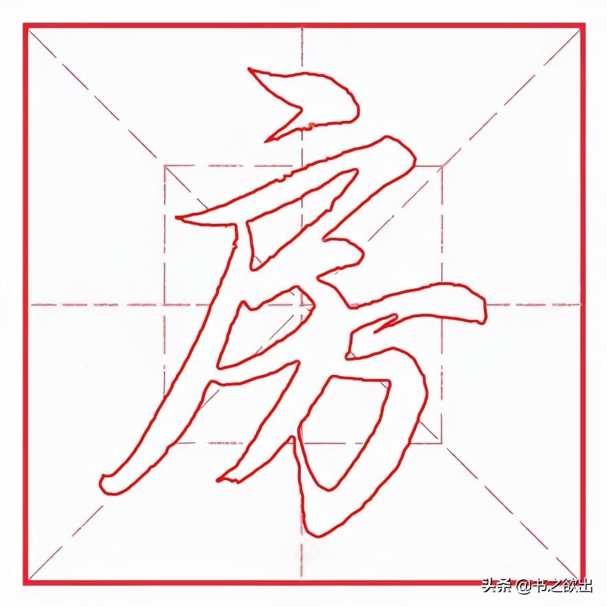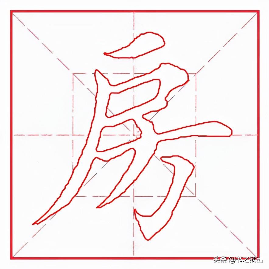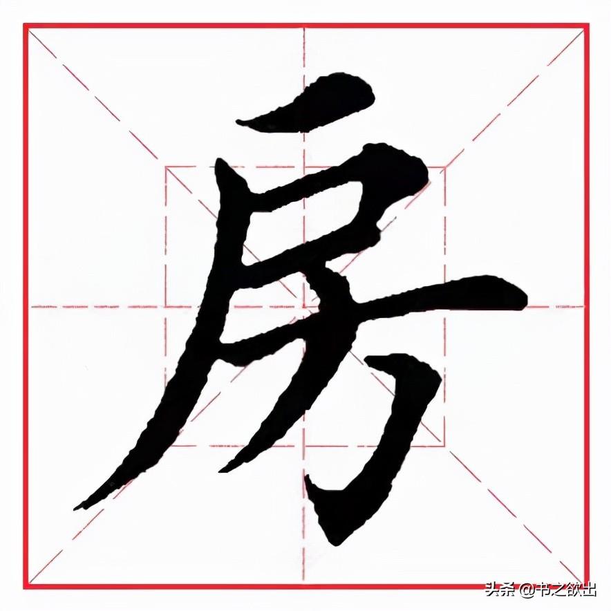 下面“方”字紧凑上靠,左收右展。点笔位于首点的中心线下方与底横半虚接起笔,勿大勿重,角度略平;横画略长,起笔后向右抗肩上行,行笔勿重,压点画的收笔而过,过点笔后行笔渐平,收笔稍向下拉,略呈拱形;横折钩位于右竖的收笔下方起笔,横画一带而过,随即稍顿笔向左下行,遒劲有力,行笔到位后跪笔弹锋出钩,钩角与点笔直对;最后撇笔与横画实接,撇身稍直,出锋勿长。