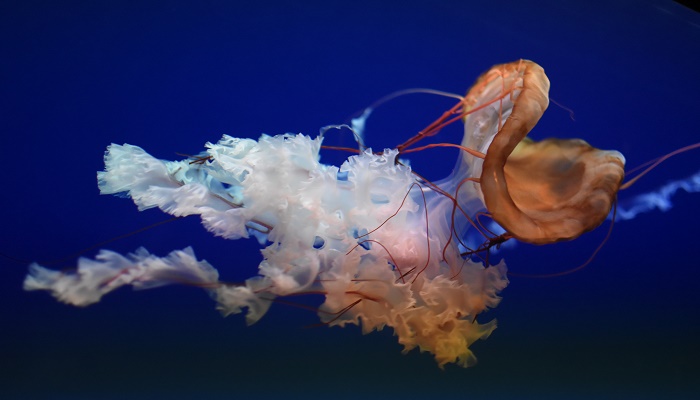 水母身体的主要成分是水,并由内外两层所组成,两层间有一个很厚的中胶层,不但透明,而且有漂浮作用。它们在运动时,利用体内喷水反射前进,远远望去,就像一顶顶圆伞在水中迅速漂游;有些水母的伞状体还带有各色花纹,在蓝色的海洋里,这些游动着的色彩各异的水母显得十分美丽。