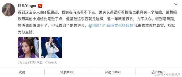 上周《创造101》播出后,因为杨超越取得第二名发布的“霸气”宣言而遭到了不少网友的diss,甚至有部分人用一些不堪的言语去评价杨超越。事情愈演愈烈,几乎快化为又一场网络暴力,连颖儿都看不下去亲自发微博力挺杨超越。