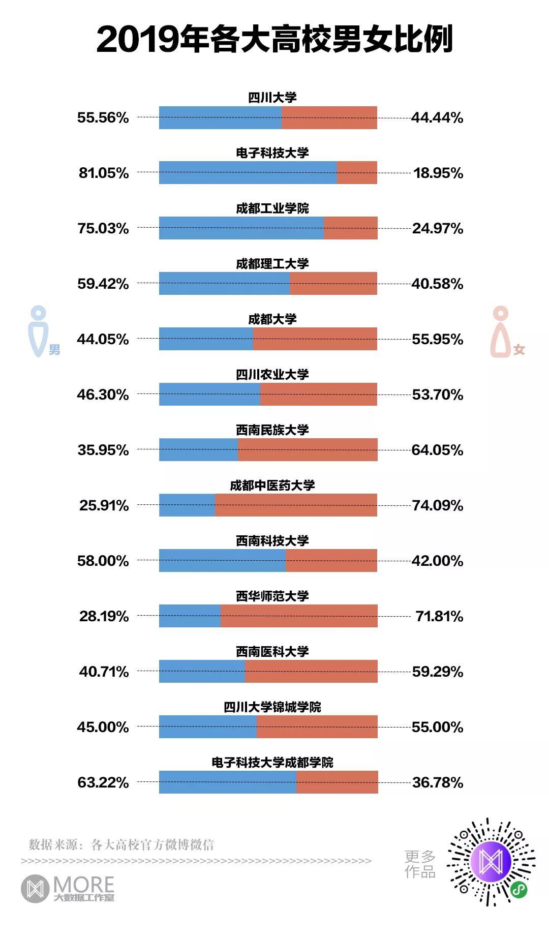 不按常理出牌的理工院校——成都理工大学,男女比例为1.46:1,平衡得不像一所理工大学。从2025年和2025年数据来看,其他诸如四川大学、四川农业大学、成都大学等院校,男女比例相对还算均衡,这些学校的同学找不到对象确实不能怪母校。