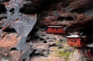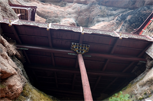 甘露岩寺就修建在一个巨大的天然洞穴之中,不过它没有在岩石内部而是在悬崖边上,距离地面大约有着百米的距离,而甘露岩寺就建造在其中。整个洞穴呈现出倒三角地形,上方是平坦的岩壁,在中段是两个小平台,如今的寺庙就建造在上面,而最下端就是直通地面的悬空部位。