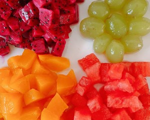 1、切水果,火龙果,葡萄,黄桃,西瓜