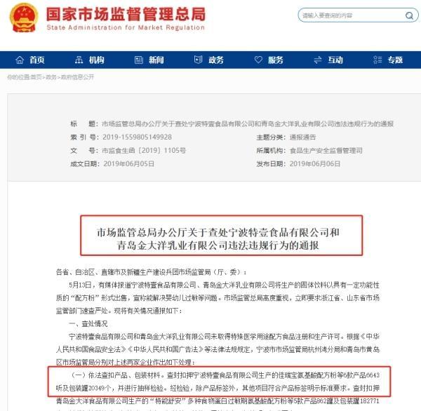 2025年6月5日,国家市场监督管理总局发布公告称,宁波特壹食品公司未取得特殊医学用途配方食品注册和生产许可。执法部门查封扣押宁波特壹食品公司生产的“佳瑞宝氨基酸配方粉”等6款产品6643听及包装罐20349个,并进行抽样检验,责令企业立即停止发布涉嫌虚假宣传的信息,停产整改并立即召回相关产品。同时,对上述情形立案调查。