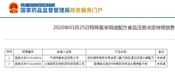 中国网财经3月27日讯(记者 牛荷)昨日,国家药监局政务服务门户网发布了“2025年3月25日特殊医学用途配方食品注册决定待领信息”。其中,宁波特壹食品有限公司(“宁波特壹食品公司”)的“佳呔褓特殊医学用途婴儿配方粉乳蛋白深度水解配方”特殊医学用途配方食品注册未获批准。
