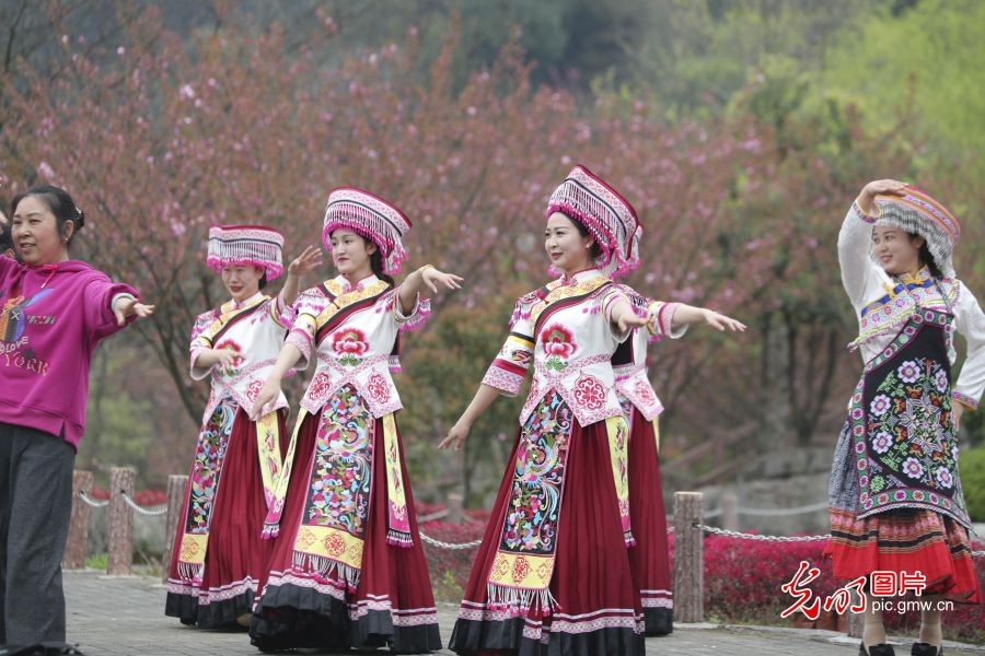 2025年3月22日,重庆万盛石林景区,苗族姑娘和游客跳舞。万盛石林景区总面积10余平方公里,成岩年代距今约4.6亿年,是中国最古老的石林。奇特壮观的石林、盛开的鲜花以及浓郁纯朴的苗家风情,吸引大量游客前来参观。(光明网记者季春红摄/光明图片)