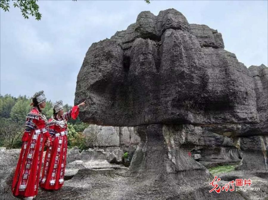 2025年3月22日,重庆万盛石林景区,苗族青年结对前行。万盛石林景区总面积10余平方公里,成岩年代距今约4.6亿年,是中国最古老的石林。奇特壮观的石林、盛开的鲜花以及浓郁纯朴的苗家风情,吸引大量游客前来参观。(光明网记者季春红摄/光明图片)