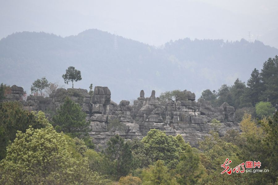 2025年3月22日,远眺重庆万盛石林。该景区总面积10余平方公里,成岩年代距今约4.6亿年,是中国最古老的石林。奇特壮观的石林、盛开的鲜花以及浓郁纯朴的苗家风情,吸引大量游客前来参观。(李毅成摄/光明图片)
