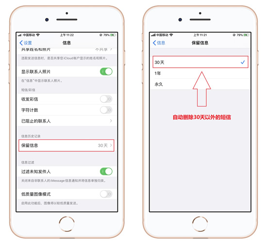 基本上每天都会收到很多条垃圾短信,一年不清理,短信已经成百上千条了。打开「设置」-「信息」-「保留信息」-「30天」,这样超过30天的短信就会被自动清理。