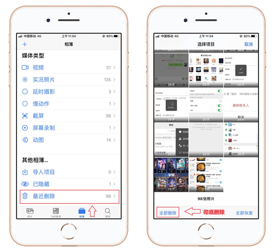 在手机相册中点击「相簿」,最底部有个「最近删除」,进入后将会看到,你之前删除的照片都跑到这里来了,点击「全部删除」,彻底清理空间。