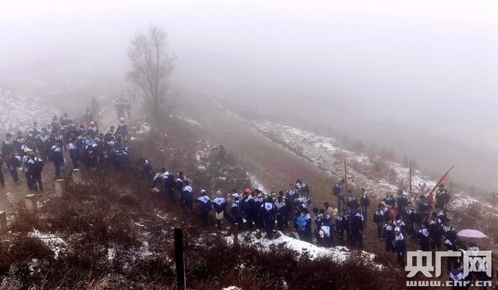 当日,天空下着雨夹雪,师生们冒着雨雪爬坡过坎、一路前行。有的同学脚陷进泥里了,互相搭把手,走不动了相互搀扶一把。路滑山陡,师生们一路互相鼓励,留下年轻的脚印和响亮的歌声。