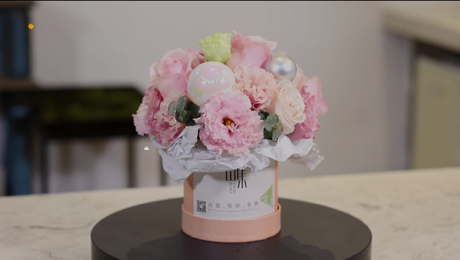 3.插入圣诞球,加入粉佳人,粉雪山,边插边转动抱抱桶,再加入浪边桔梗,最后加入尤加利叶,调整雪梨纸。