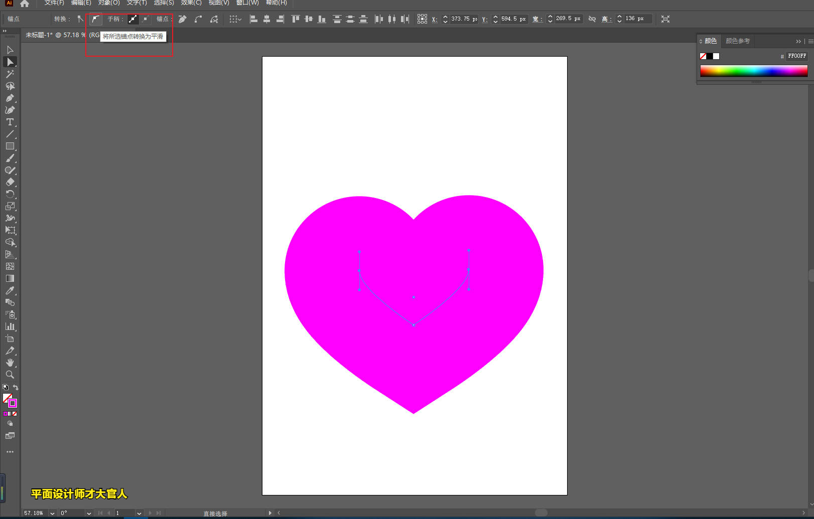 5、再次选择【小白工具】;框选上方两个锚点;改成平滑;见证奇迹的时刻!心形就ok了!