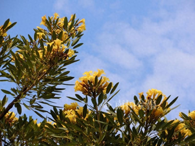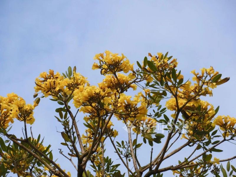 近日,柳州的天气炎热,位于迎宾路的金花风铃木开出了朵朵金黄色的小花,在蓝天的衬托下分外耀眼,形成夏日里的美艳景观。