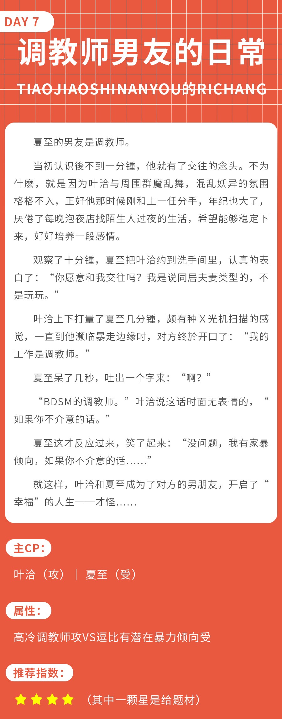 光看名字的时候担心会有点儿重口儿,看tag是温馨甜文才放心开始看的,两个人的相遇就很狗血,叶洽是夏至从酒吧里捡来的男盆友,后面的生活日常也不是重口的那种,一开始叶洽尽量不让夏至接触自己的工作,后面带着叶洽认识了圈子里的人,也让我这个读者意识到命运馈赠的礼物暗中都标好了价格,普通人想要获得与努力不相匹配的权利和欲望就得付出代价,还有点儿正能量。