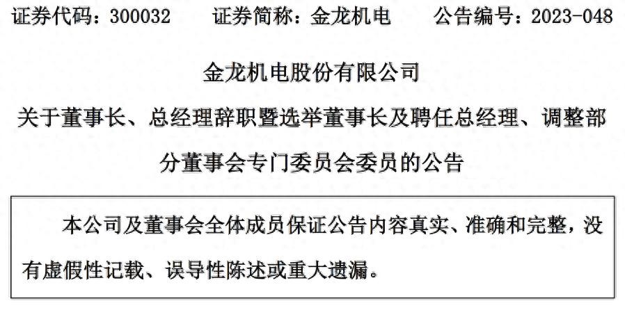 金龙机电(300032)发布公告称,金龙机电股份有限公司(以下简称“公司”或“本公司”)董事会于 2023 年 11 月 29 日下午收市后收到公司董事长、总经理黄磊先生递交的书面辞职报告。黄磊先生因个人身体原因申请辞去公司董事、董事长、董事会相关专门委员会委员(战略委员会主任委员、薪酬与考核委员会委员)及总经理职务,不再代行董事会秘书职责。辞职后,黄磊先生将不在公司担任任何职务。