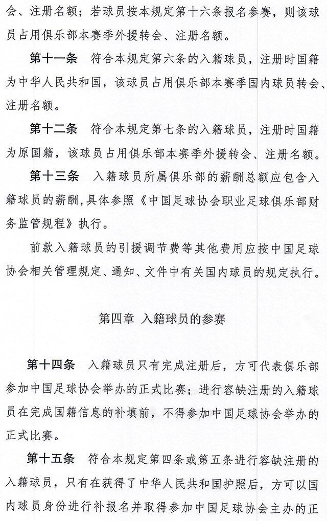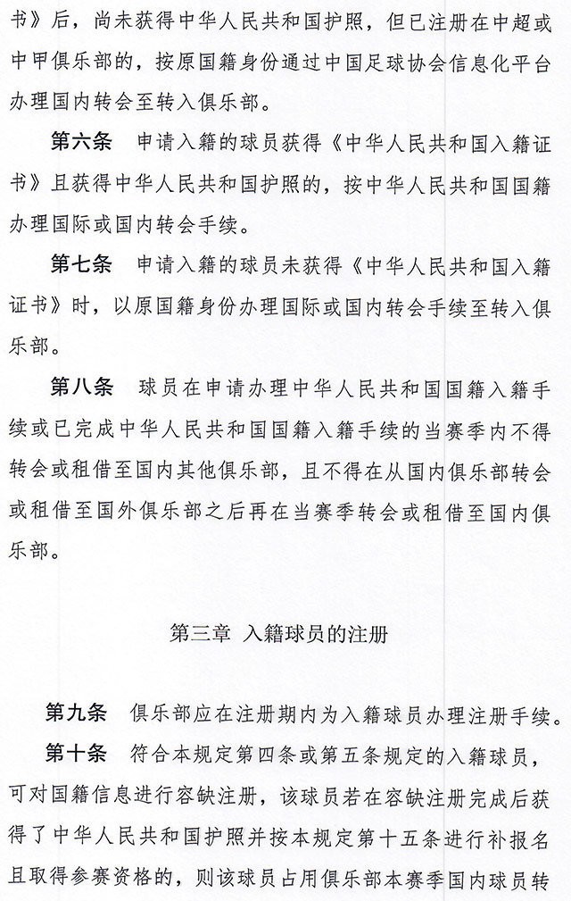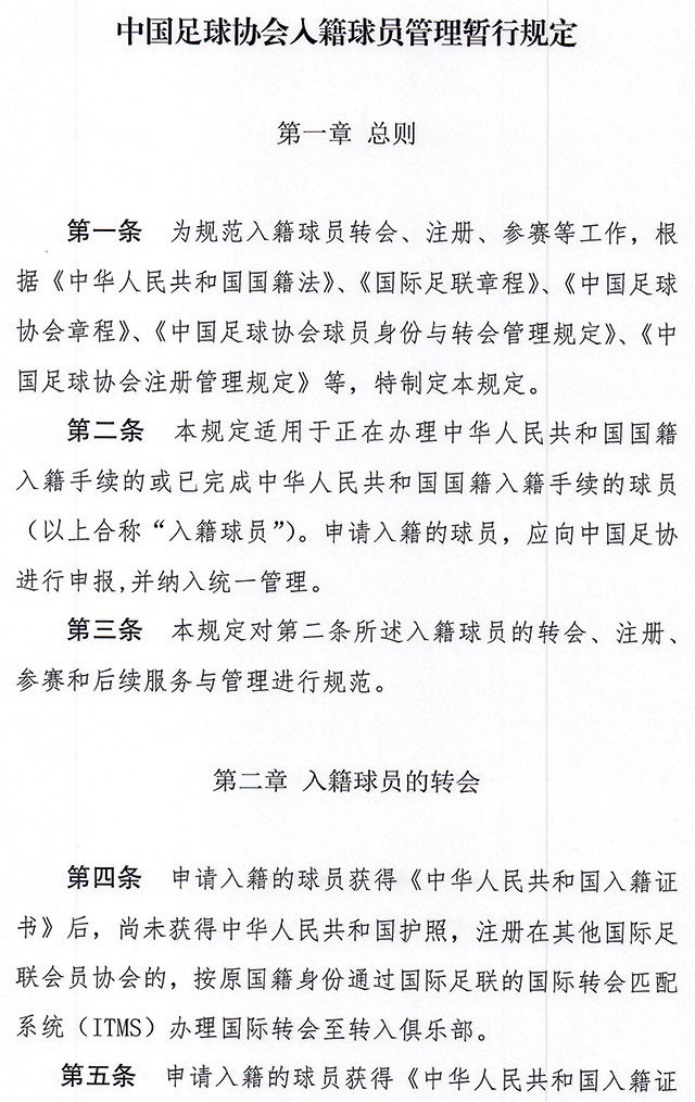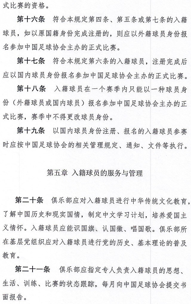 中国足协发布了《中国足球协会入籍球员管理暂行规定》,说明了归化球员在注册、转会、行为等方面的准则。其中包括,归化球员需进行中华传统文化教育,了解中国历史和现实国情,制定中文学习计划,培养爱国情怀;能认国旗、认国徽、唱国歌。并需专人负责,每月向足协报告。详情见下图: