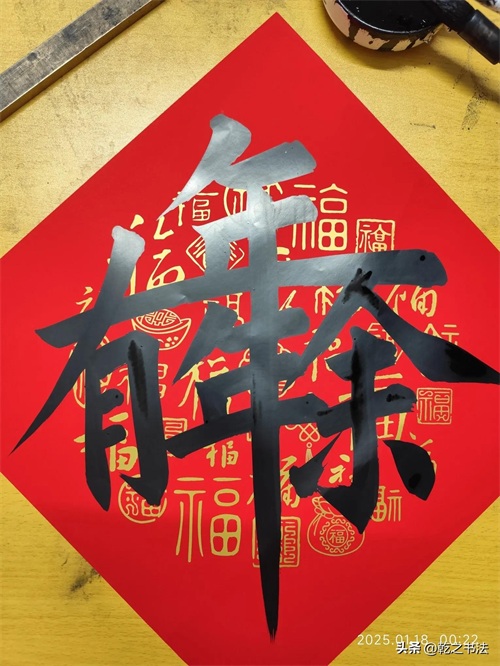 年年有余,这4个字两个年字,上下重叠。友字在左边,鱼字在右边来,让整个字结构严谨,达到视觉平衡,左右均匀。注意中间这个长横不要写的太粗,一定要写的稍微细一点长。如果写出了,那整个字形就会发生改变,显得特别重,特别笨!