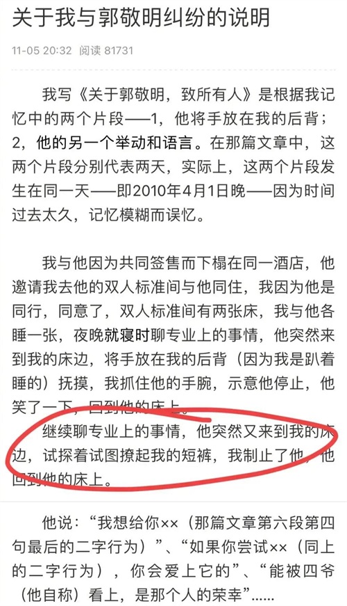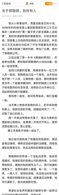 郭敬明性骚扰事件再次引起轩然大波!作家李枫在深夜发文,揭露了被骚扰的细节和牵扯到的郭敬明公司的五位男同事。