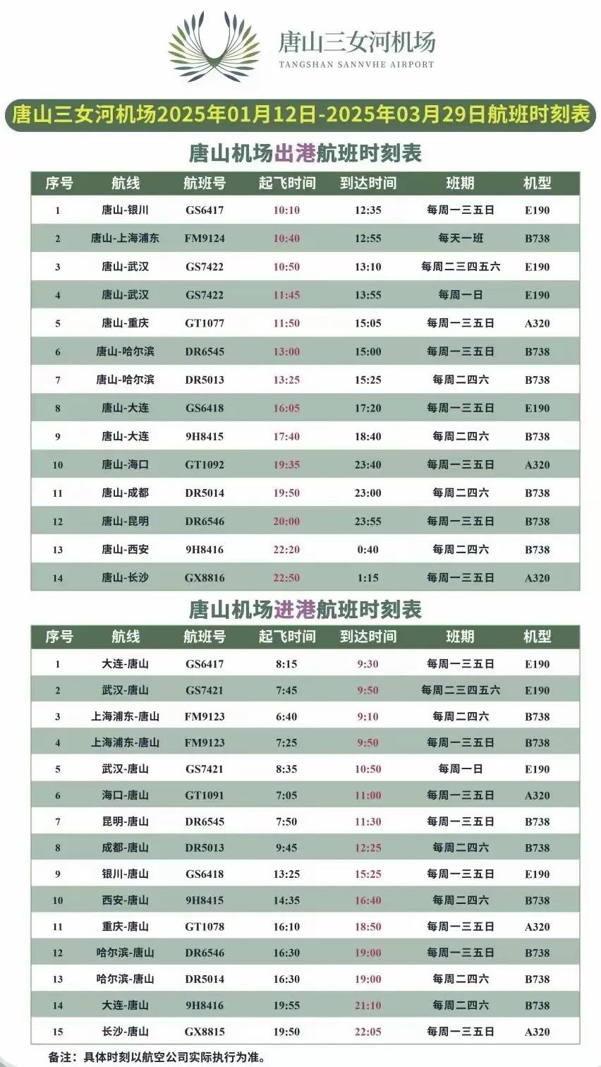未来唐山三女河机场即将升级成4D级机场,机场硬件设施和公共服务保障也将逐步完善,成为冀东地区(环渤海大湾区)重要枢纽机场,东北亚重要门户机场。机场目前已经开通哈尔滨、沈阳、上海、长沙、合肥(2022年恢复)、西安、成都、大连、昆明、海口(去年6月恢复)、三亚(本季不直飞,曾于2023年冬季恢复)、桂林(去年6月恢复)、重庆(去年6月恢复)、杭州(上季直飞)、宁波(2022年冬季曾恢复)、青岛(2022年冬季曾恢复)、呼和浩特(上季直飞)、广州(已停航,等待恢复)、佛山(已停航)、武汉、宜昌(已停航)、兰州(当前无直飞,2022年冬季曾开通)、石家庄(2022年曾恢复)、温州(2022年曾恢复)、厦门(2022年恢复)、贵阳等航线。此外,三女河机场还直飞过乌海、扬州、三亚等旅游航线。