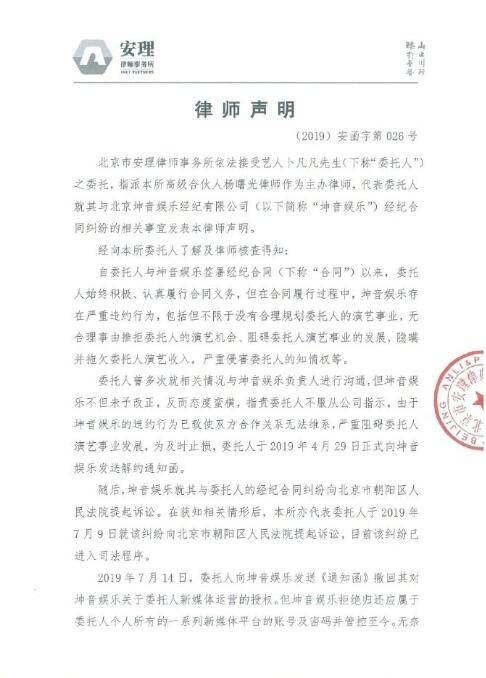 近日,坤音四子成员卜凡通过律师发表声明,表示自己与坤音娱乐签约以来,始终积极履行合同义务,但在履行过程中,坤音娱乐存在严重违约行为,严重侵害自己知情权,目前已就该纠纷向法院起诉。网上掀起热议。
