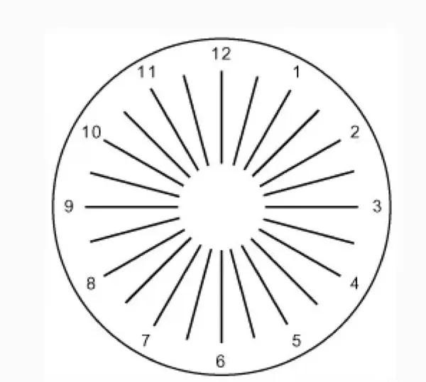 图二:测试散光。如果所有线条都粗细均匀,证明眼睛无散光现象,如果某一线条黑而清晰,其他线条模糊则有散光的可能。