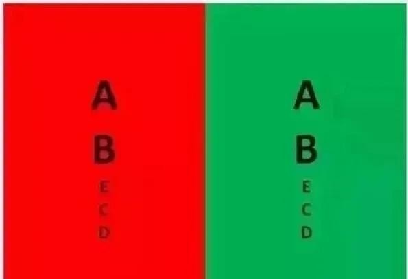 图五:测试老花。红绿色盲者及红绿色弱者能在图中看到5,正常人看到的红绿背景上的字母一样黑,如果红色字清楚,则是出现近视。如果绿底字清楚,就是老花眼