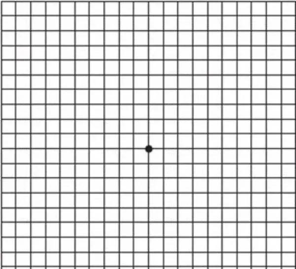 图六:测试黄斑变性。盖着一只眼用另一只眼看图中央的黑点,如果发现图片中心有黑影或者周围出现变形、扭曲或缺角,那么很有可能你的黄斑出现了问题……需要及时到专业的眼科机构来看看。