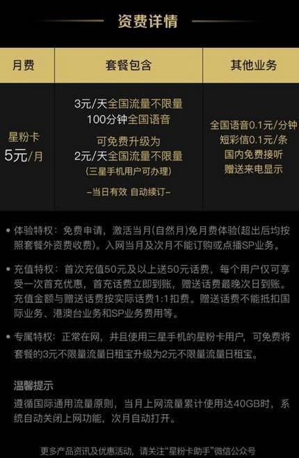 三星联合联通推出星粉卡,3月16日正式上线办理。 月租仅需5元!!! 每天2元即可享受无限全国流量!所有APP都不限制啊! 办理首月免月租体验,前6个月每月送100分钟全国语音通话。首充50送50。