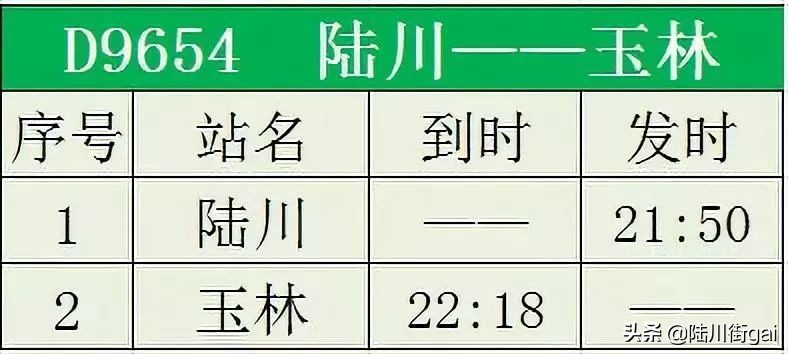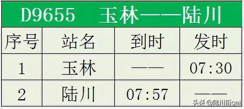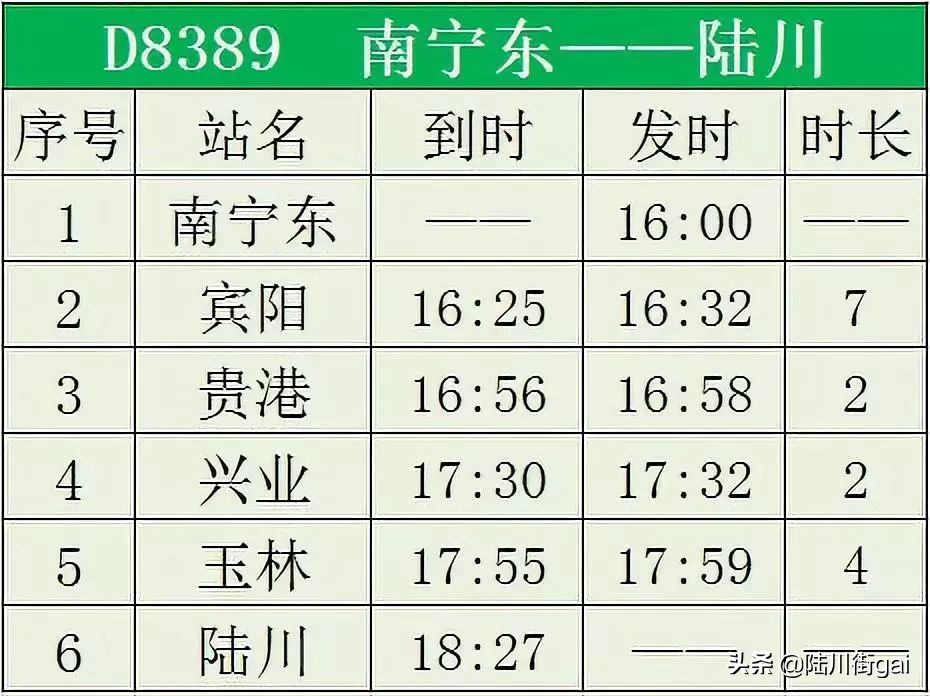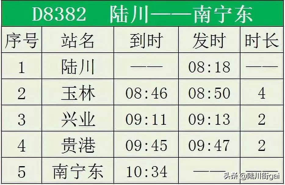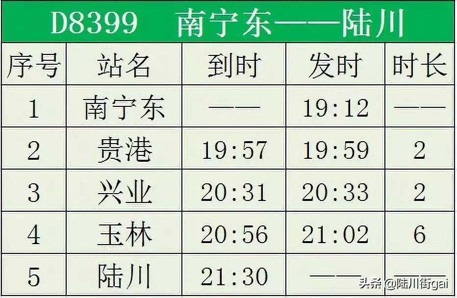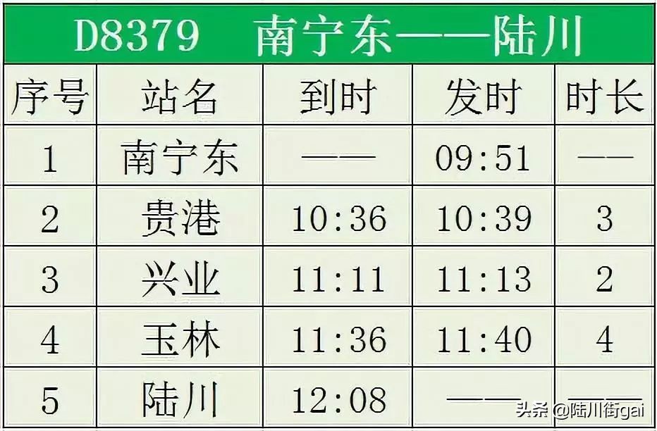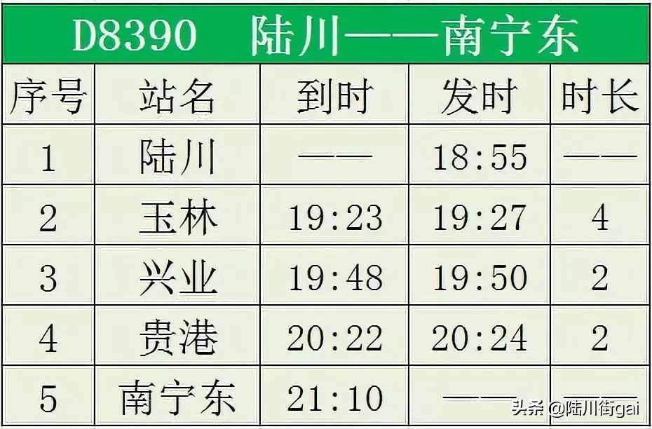 ❶ D9655 玉林~陆川 ❷ D8382 陆川~南宁东 ❸ D8379 南宁东~陆川❹ D8482 陆川~桂林北❺ D8389 南宁东~陆川❻ D8390 陆川~南宁东 ❼ D8399 南宁东~陆川 ❽ D9654 陆川~玉林