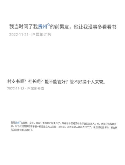 我是云南“的苗族,女生,大部分蛊术都已经失传了,现在基本已经没有会下蛊的苗族人了啊,大部分苗族都很穷,因为我们苗族的寨子基本都是建在大山深处,现在的。苗族年轻人都出去打工了,谁还研究蛊术哟,都在研究怎么赚钱解决温饱了。