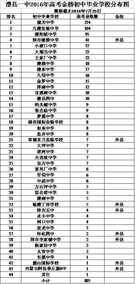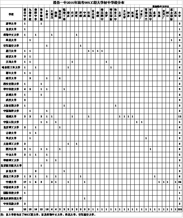 其中985工程大学、香港中文大学、悉尼大学和空军航空大学录取的学生共155名,分列前五名的初中毕业学校为:城关中学53名、九澧实验学校19名、澧阳镇中学14名、津市德雅中学12名(外县)、小渡口镇中学10名。