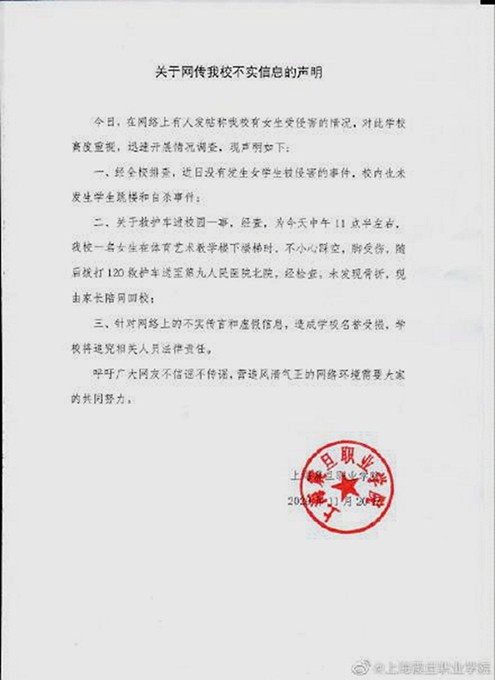 11月20日,网传上海震旦职业学院发生一起轮奸案,受害人已自杀。对此,校方发布公开声明,对社会公众做出辟谣。