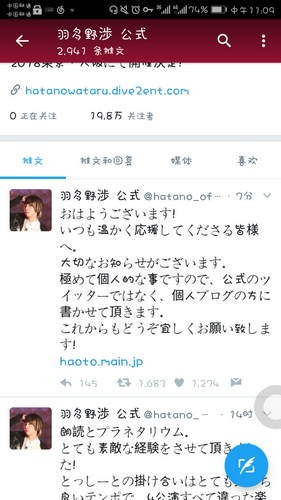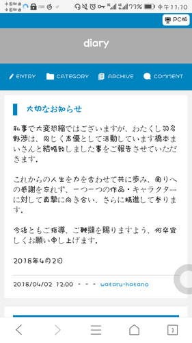 根据声优羽多野涉在本日(4月2日)发布的博客消息,自己已经和同样从事声优活动的桥本舞结婚了。