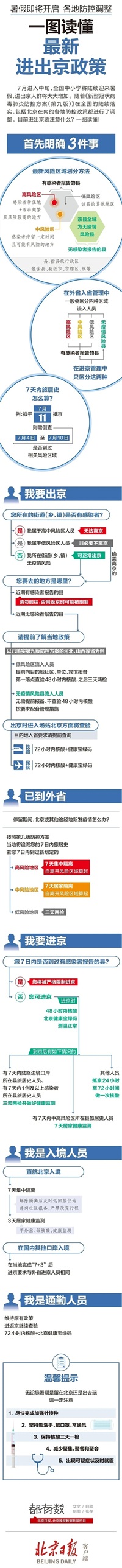 7月进入中旬,全国中小学将陆续迎来暑假,进出京人群将大大增加。随着《新型冠状病毒肺炎防控方案(第九版)》在全国的陆续落实,包括北京在内的各地防控政策都进行了调整。目前进出京要注意什么?一图读懂!