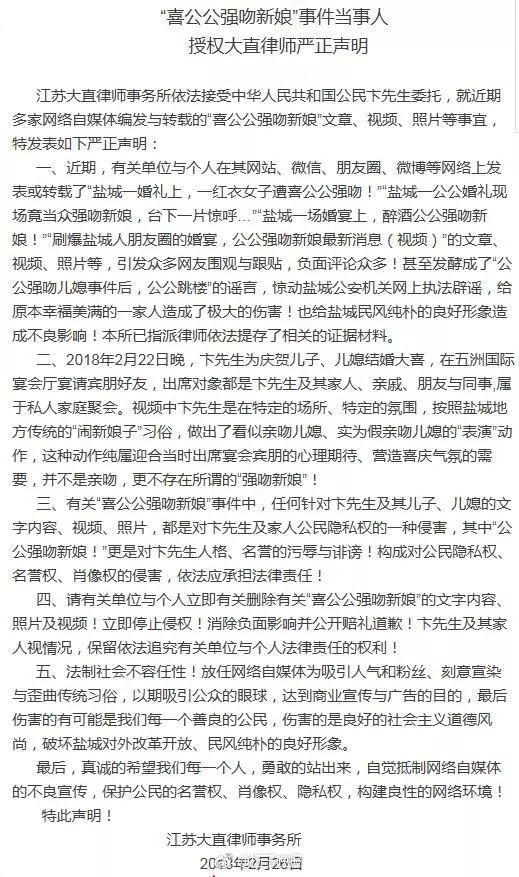 “盐城公公强吻新娘”涉事人发声明:表演动作没有真亲