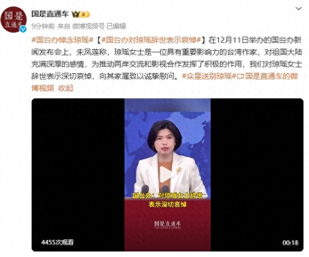 国台办对琼瑶去世表示哀悼