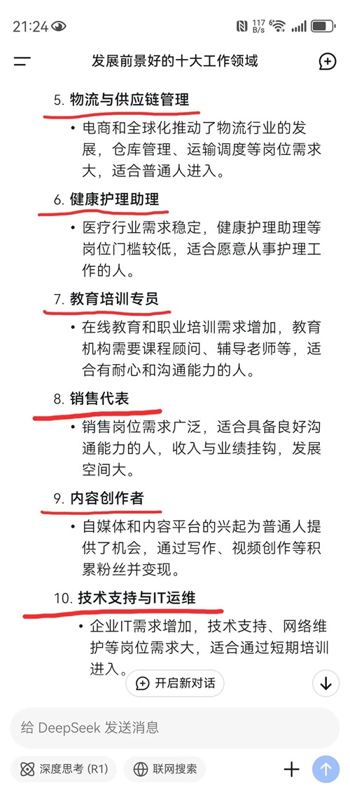 Deepseek分析:对于普通人来说,以下工作领域不仅发展前景好,且门槛相对较低,适合通过学习和实践逐步提升