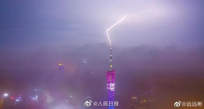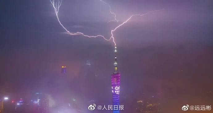 广东进入“龙舟水”时期以来雨水不断。7日傍晚,网友@远远彬 拍到了雷击广州塔全过程,戳图↓安全第一,注意防范!(人民日报)
