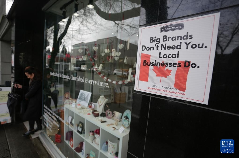 2月25日,加拿大温哥华一家商店外张贴着宣传本地企业的标牌。